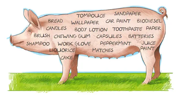 However, pigs are not reared solely for their meat. Their bones are used to make glue and the fat is used in shampoo and body lotion. Their organs are used for medicines and their bristles for brushes. In fact, nothing is wasted from the pig.