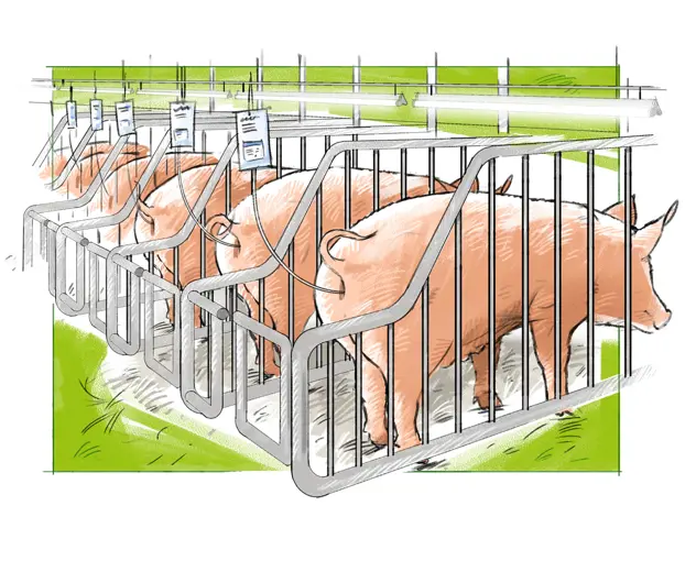 The sows that are pregnant with the piglets move to the sow stall where it is nice and quiet, so the pregnant sows can all rest. They need to get a lot of rest and eat well so the piglets in their belly are healthy and grow properly. They are given a special feed with extra fibre to keep them happy and healthy. They can also walk around, lie down and eat whenever they want.