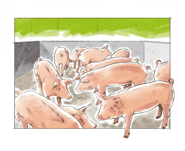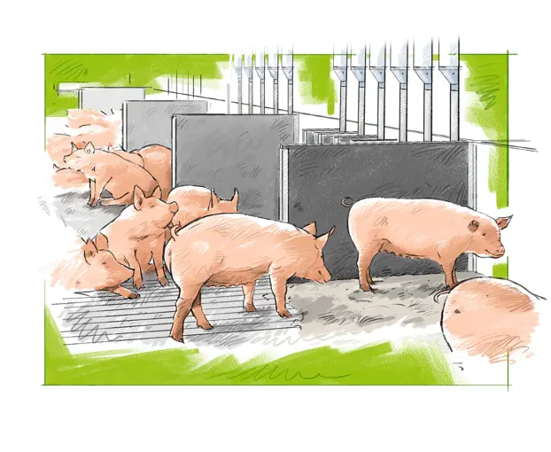The route from pig to pork starts with a mum (sow) and dad (boar) pig. All male piglets born at the breeding farm go to either a stall or to a finishing farm to be reared for meat.